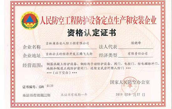 吉林省浩安人防工程有限公司是經(jīng)國家人民防空辦公室批準(zhǔn)成立的人防工程防護設(shè)備定點生產(chǎn)廠,2019年認定為國家級高新技術(shù)企業(yè)。本廠擁有現(xiàn)代化的廠房及先進的生產(chǎn)設(shè)備,集生產(chǎn)制造、質(zhì)量控制、銷售服務(wù)為一體的區(qū)域性行業(yè)廠。公司座落在吉林省公主嶺經(jīng)濟開發(fā)區(qū),占地面積達10000平方米,辦公樓1200平方米,廠房建筑面積達6000平方米以上,注冊資金1000萬元,企業(yè)的技術(shù)力量雄厚,其中防護工程師,高級工程師及中高級專業(yè)技術(shù)人員占30%。青海分公司2018年10月15日成立,于當(dāng)年11月26日通過 青海人民防空辦公室備案公示。 本廠經(jīng)營的主要產(chǎn)品:連續(xù)玄武巖纖維新型人防防護門、鋼結(jié)構(gòu)人防防護門、鋼筋混凝土人防防護門以及各種型號的通風(fēng)設(shè)備和防化設(shè)備。本廠生產(chǎn)設(shè)備齊全,擁有雄厚的生產(chǎn)能力和技術(shù)水平,并嚴格按照國家相關(guān)標(biāo)準(zhǔn)生產(chǎn)和安裝。2015年5月15日正式開業(yè)至今,承接吉林省人防工程項目上百項,總施工面積超過百萬平方米。工程項目包含人防指揮所、醫(yī)院、地下商場、商場、學(xué)